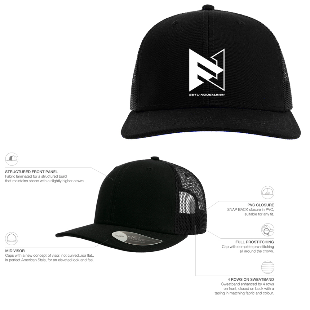 6-paneelinen Trucker-lippis, snap back-kiinnityksellä sekä verkkoperällä.