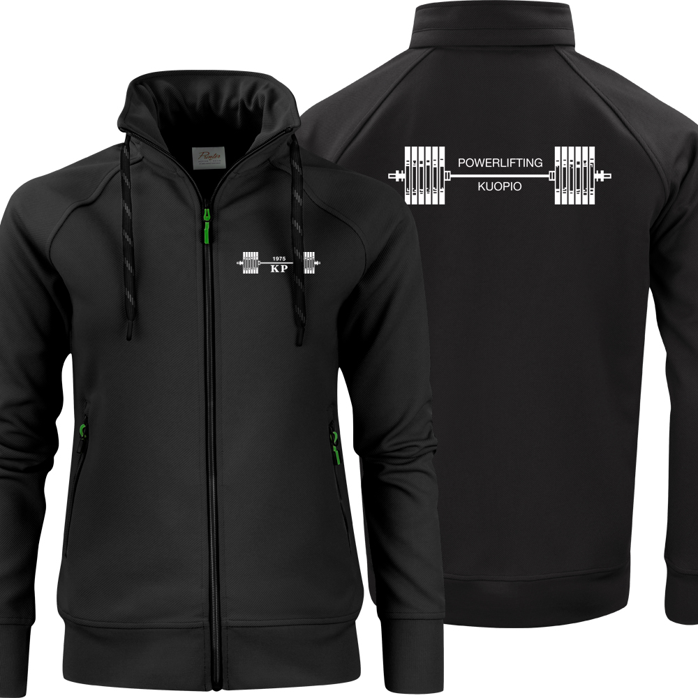 Printer takki. Sporttinen takki on valmistettu 100 % kierrätetystä polyesterista. Vetoketjullisessa takissa on raglanhihat ja kauluksessa kaksiväriset kiristysnauhat sekä vetoketjukiinnitys ja kaksi vetoketjullista etutaskua kontrastivetimillä. Kauluksessa piilovetoketju, jonka kautta vaihdat helposti kiristysnauhat.