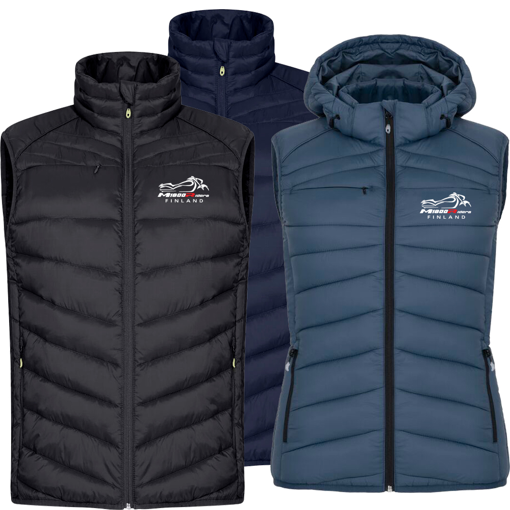 Lämmin mutta kevyt liivi untuvaa muistuttavalla toppauksella. Valmistettu kierrätetystä polyamidista. Irrotettava huppu, 3 vetoketjullista ulkotaskua ja 2 sisätaskua. Joustavat resorit vyötäröllä. Naisten mallissa on irrotettava huppu. Mukana värillinen ripustin, kätevä kuulokeratkaisu ja vetoketjun vedin.