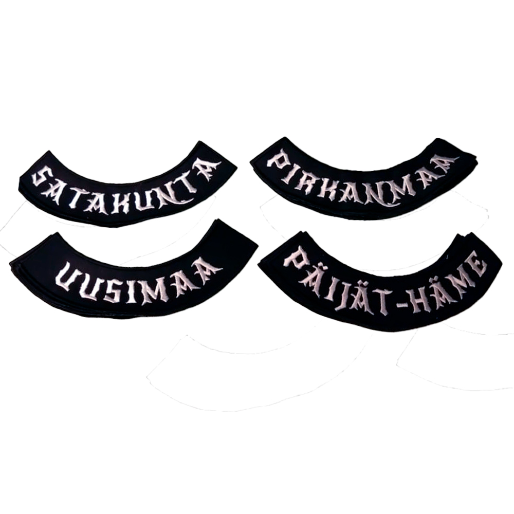 Musta kangasmerkki mustalla reunalla ja valkoisella tekstillä. Merkin leveys n. 24 cm.