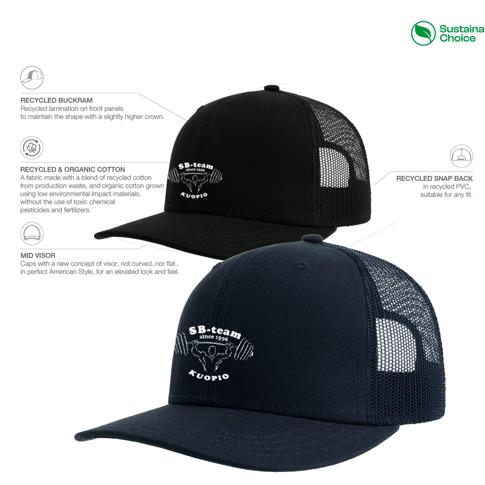 Värikäs 6-paneelinen trucker-lippis. Valmistettu kierrätetyn ja luomupuuvillan sekoituksesta. Mid Visor-visiiri ja kierrätetystä materiaalista valmistettu snapback-suljin.